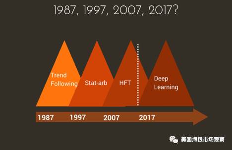 他也在演讲中提到了交易创新的十年周期: 以十年为期,1987-1997年是趋势追踪(Trend Following)的黄金时期。然后1997年开始的统计套利开始取代传统的趋势交易,直到2007年夏天的量化崩盘。接着是2007年开始的十年高频交易黄金时期,逐渐衰落后,被2017年开始的人工智能深度学习所取代。