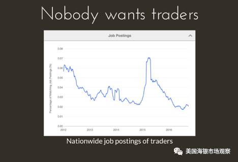 高拉弗这次的演讲主题是“投资管理的新纪元-深度学习和大数据技术”。他的演讲一开始就回顾了过去十年的华尔街就业市场的变化,首先是交易员职位(Trader)的大量减少,其次是量化分析员(Quant)职位的大量减少,反过来大幅增加的职位是金融科技的职位(Fintech)和人工智能(Artificial Intelligence)的职位。实际上,从2008年金融危机以后,华尔街的恢复是非常缓慢,而且有选择性的。很多传统的职位已经无法再被恢复。